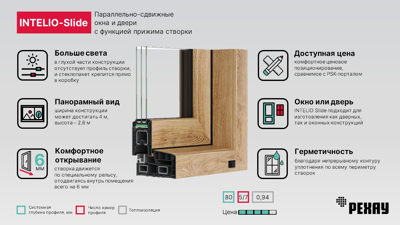 INTELIO Slide - параллельно-сдвижные окна и двери с функцией прижима створки. Это удобная система, с легким открыванием и отличными характеристиками по теплотехнике и герметичности, которую можно установить, как в качестве окна, так и в дверном проеме. Технология ламинации РЕХАУ предоставляет широкие возможности для выбора конструкции в разных дизайнерских исполнениях.
